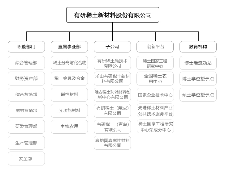 有研稀土新材料股份有限公司(简称有研稀土)是2001年由中国有研科技集团有限公司(原北京有色金属研究总院)作为主发起人对稀土国家工程研究中心经营性资产进行改制而设立的股份公司,是国家高新技术企业。其前身1952年开始稀土研究,是我国最早从事稀土研究开发的单位之一, 也是我国稀土工业技术的主要发源地。