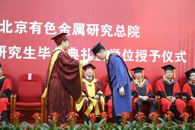 伴随着激昂的乐曲,学位评定委员会委员依次走上主席台,毕业典礼拉开序幕。熊柏青首先宣读了学位评定委员会授予高彤宇等18名同学博士学位、柯灵升等49名同学硕士学位的决定。有研总院名誉院长、学位评定委员会名誉主席屠海令院士,有研总院院长、学位评定委员会主席赵晓晨分别为博士毕业生、硕士毕业生逐一扶正流苏并颁发学位证书。屠海令为获优秀博士学位论文、优秀硕士学位论文的同学及导师颁奖,赵晓晨为获一、二、三等院长奖学金的同学颁奖。